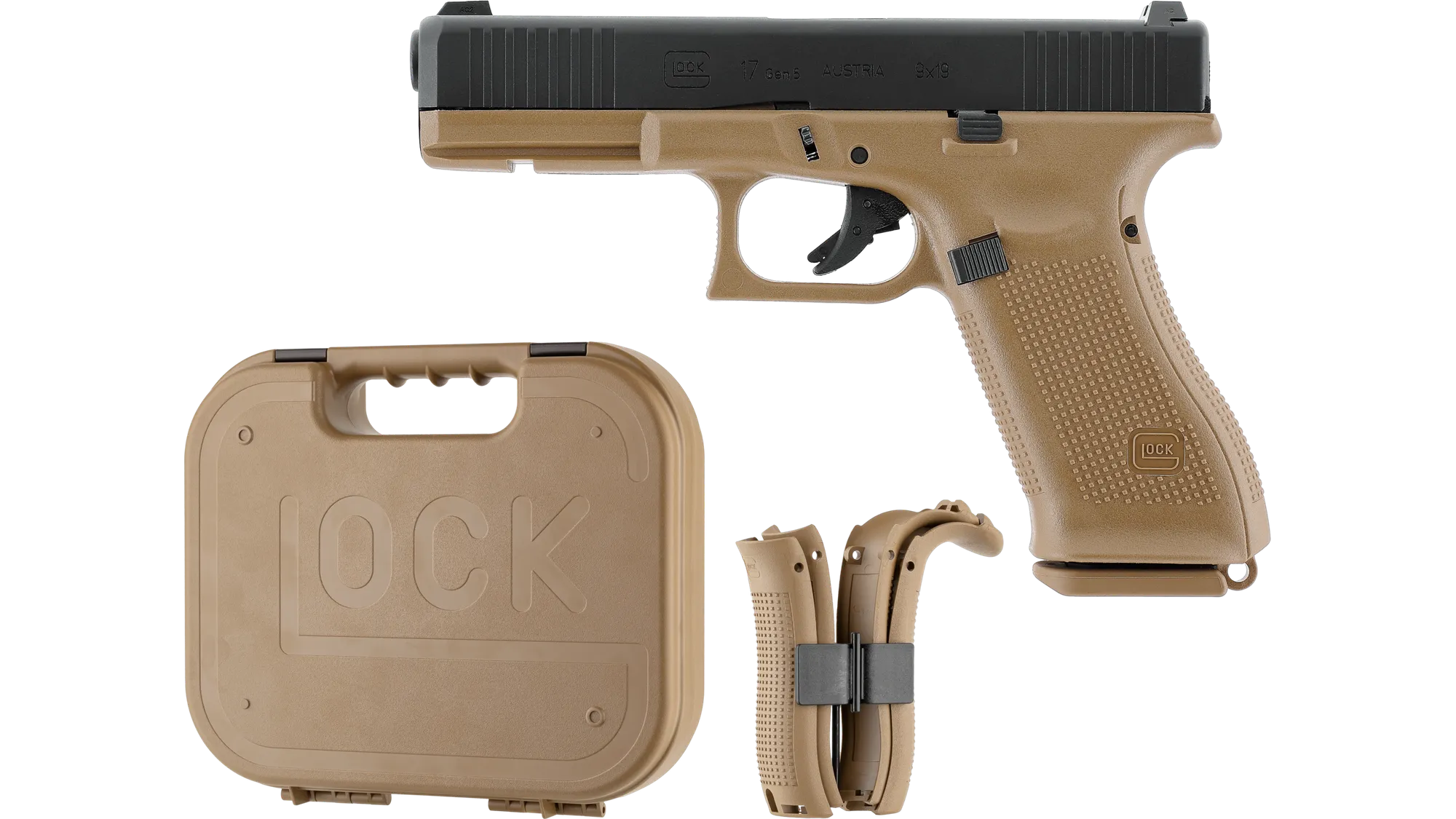 Le Glock 17 Gen5 French Edition est une réplique airsoft sous licence, alimentée au gaz. Elle adopte une carcasse couleur coyote avec œillet détachable pour dragonne et est livrée dans la mallette originale accompagnée de quatre dos de poignée interchangeables et d'un outil de remplacement.
