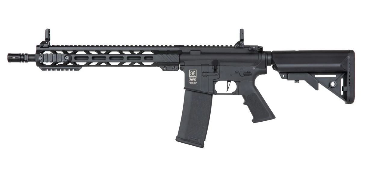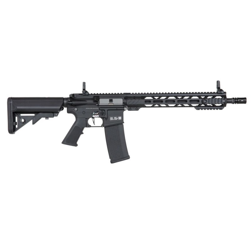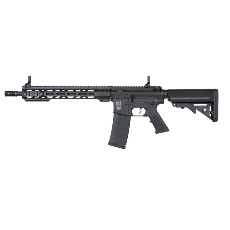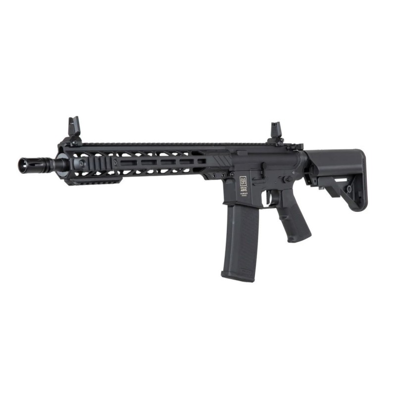 Caractéristiques : - Matériaux : polycarbonates - Longueur : 795mm / 880mm - Longueur du canon interne : 270mm - Poids : 2350g - Diamètre du canon : 6.03mm - Gearbox : V2 - Hop up : Réglable - Crosse réglable : 5 positions - Puissance : 310 fps avec ressort m100 - Changement rapide de ressort : oui - Gearbox sur roulement équipée du système ESA - Chargeur : type M4 - Capacité du chargeur : 300 billes