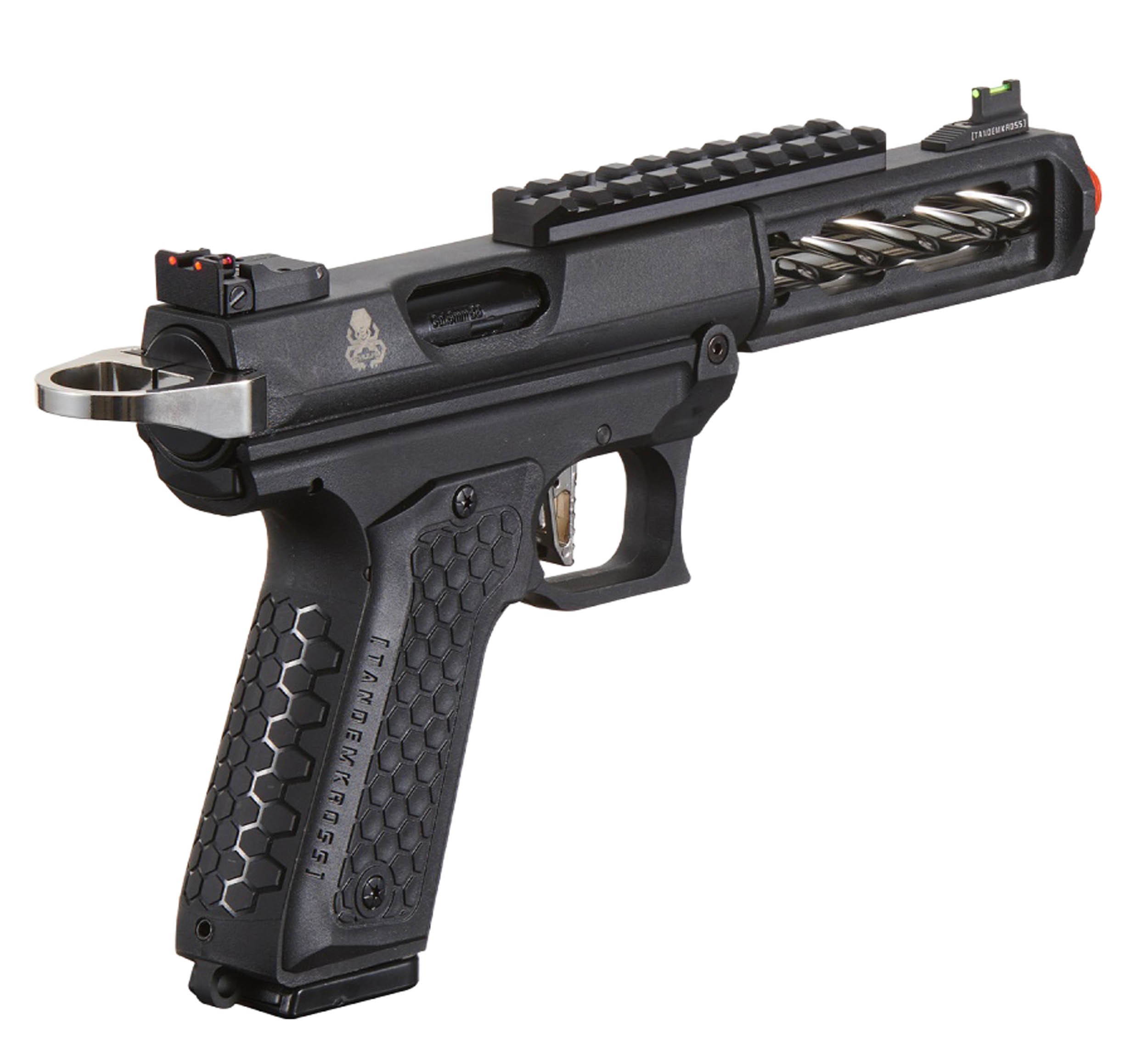 Découvrez le nouveau pistolet à gaz Tandemkross CTHULHU en noir/silver. Fabriqué en polymère renforcé, ce GBB semi/full auto bénéficie d'un design entièrement sous licence. Cette réplique est doté d'un compensateur carré innovant "Game Changer Pro", d'un repose-pouce CNC, et d'une détente "squelette". De plus le Tandemkross Hivegrip assure une prise en main solide. Avec un anneau de chargement "Halo" et des viseurs à fibre optique "Eagle Eye", ce pistolet offre une précision inégalée. Le chargeur de 24 coups et le hop-up réglable renforce sa polyvalence.